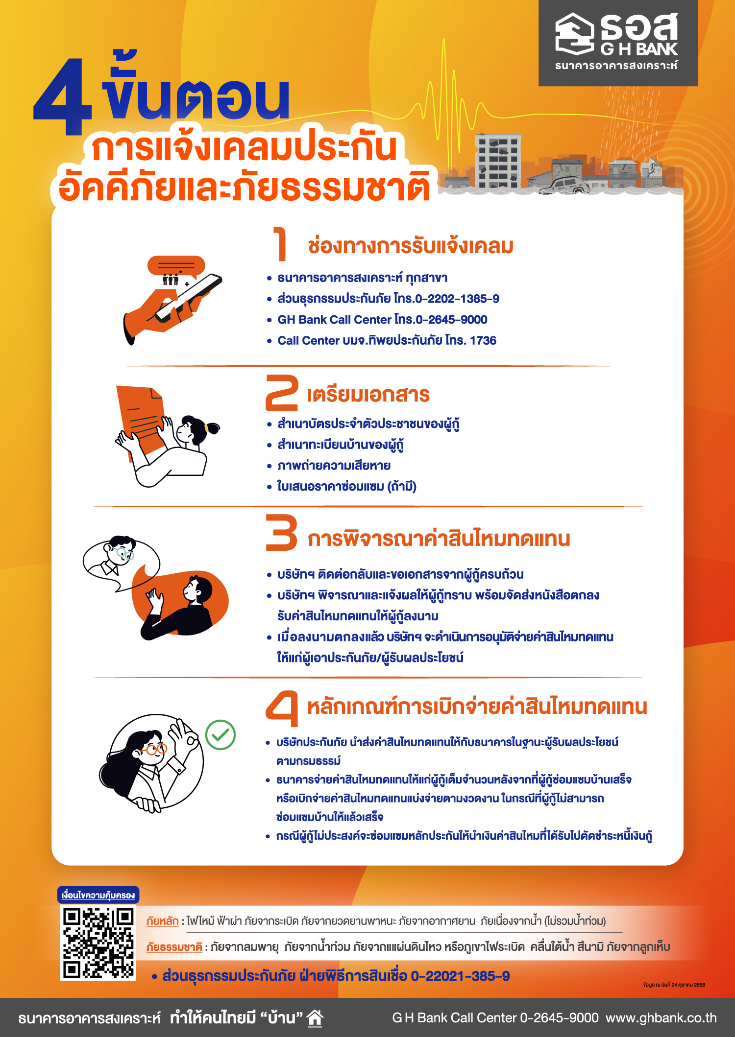 จากสถานการณ์อุทกภัยที่เกิดขึ้นในหลายพื้นที่ทั่วประเทศ ทำให้เกิดการสะสมของปริมาณน้ำและท่วมบ้านเรือนประชาชน ส่งผลต่อความเป็นอยู่และการประกอบอาชีพ ธนาคารอาคารสงเคราะห์ (ธอส.) ในฐานะสถาบันการเงินเฉพาะกิจของรัฐ ที่มีพันธกิจ “ทำให้คนไทยมีบ้าน” มีความห่วงใยลูกค้าและประชาชนในพื้นที่ที่ได้รับผลกระทบจากอุทกภัย และได้ออก 7 มาตรการ พักชำระหนี้ - ลดเงินงวด – ลดดอกเบี้ย – เคลมสินไหมเร่งด่วน ช่วยเหลือและเยียวยา ผู้ที่ได้รับผลกระทบพร้อมช่วยเหลือผู้ที่ได้รับผลกระทบ เพื่อบรรเทาภาระด้านที่อยู่อาศัย และช่วยให้ประชาชนกลับมาดำเนินชีวิตได้เร็วที่สุด ผ่าน “มาตรการช่วยเหลือผู้ประสบภัย ปี 2568”